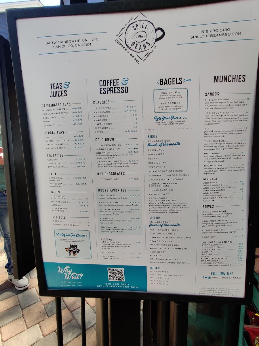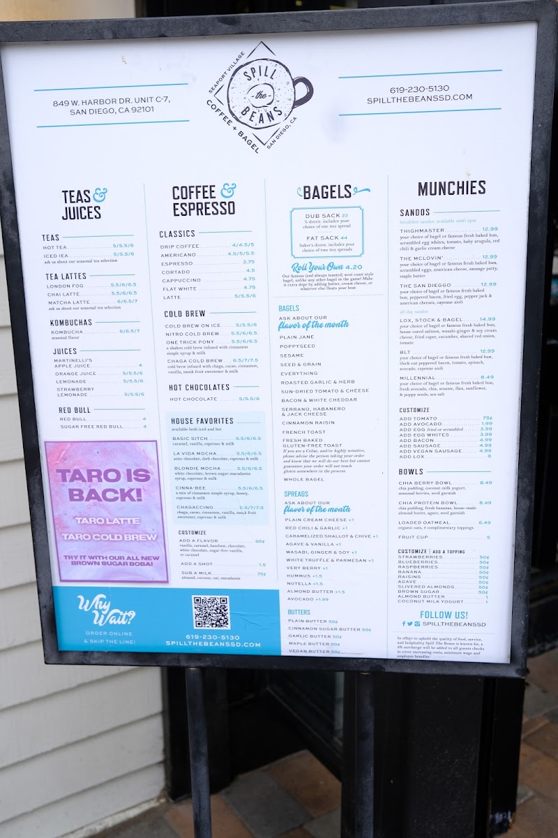Welcome to Spill The Beans Coffee and Bagels, a charming waterfront café located at 813 W Harbor Dr in San Diego, CA. This delightful spot offers an inviting selection of culinary delights that promises a true sensory experience. Explore their exceptional beverage menu featuring the acclaimed la vida mocha made with rich Aztec dark chocolate and a hint of cinnamon, best enjoyed at the perfect temperature. For bagel lovers, the spicy jalapeno and cheese bagel packs a flavorful punch, while the San Dieggo breakfast sandwich embraces locals with its robust ingredients like peppered bacon and melty cheese.